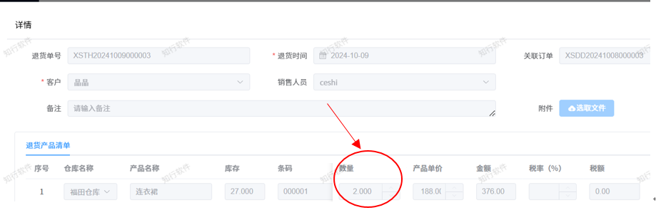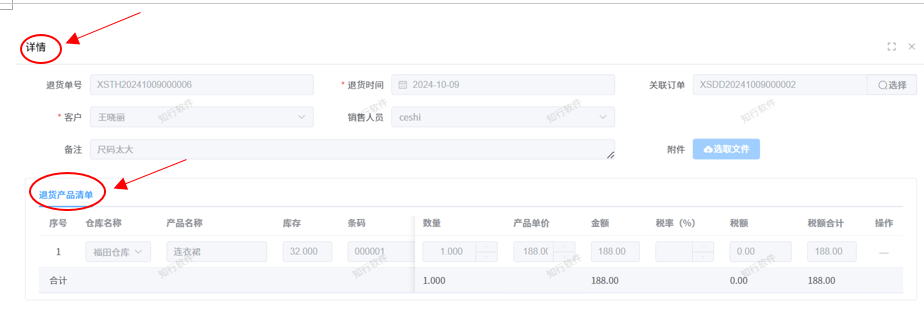 我们还可以看到该销售退货单的具体信息、如详细资料,包含该销售订单的基本信息以及系统信息;退货产品清单,包含仓库名称、产品名称、库存、条码、数量、产品单价以及合计总金额。