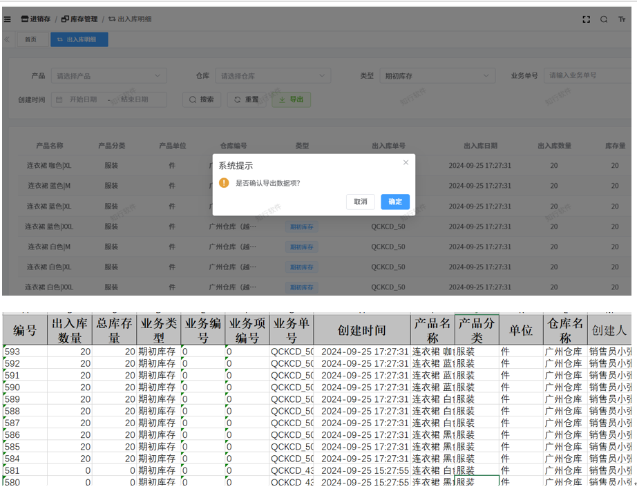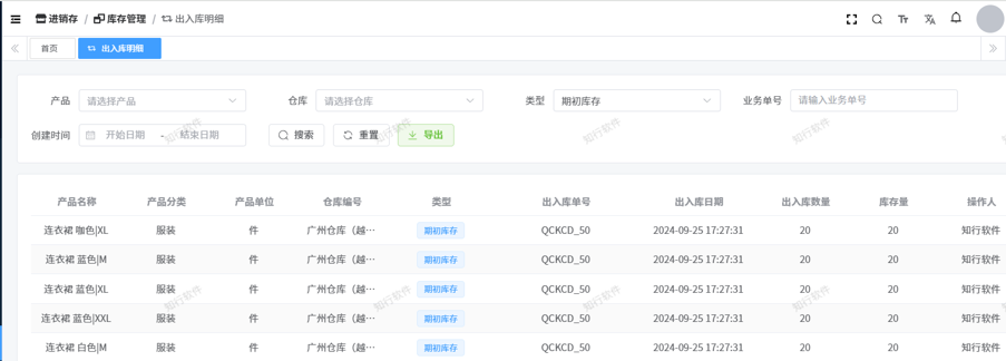 此外,出入库明细模块还支持数据导出功能。用户只需点击“导出”按钮,就可以将数据导出为Excel文件,方便后续进行财务分析和业务汇报。