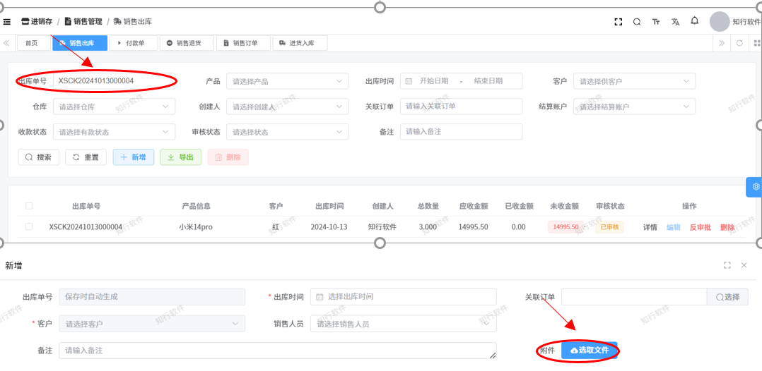 点击生成的出库单号,用户可以查看详细的出库单信息,包括产品名称、单位、数量以及操作人员的记录。同时,用户可以上传附件,补充更多相关的订单信息,确保所有信息齐全。