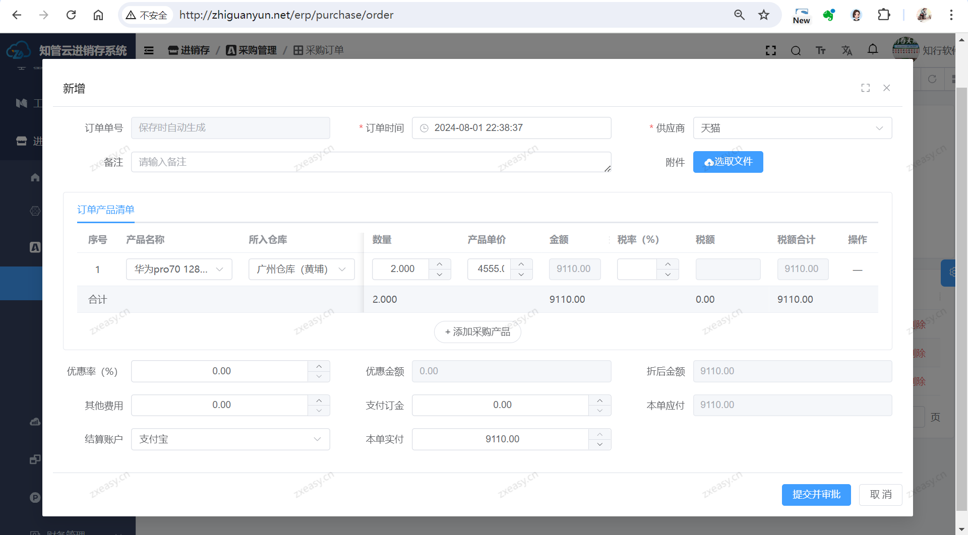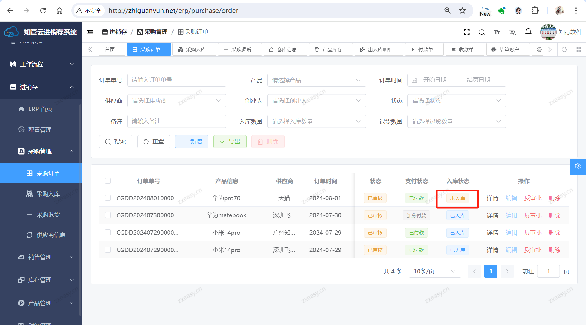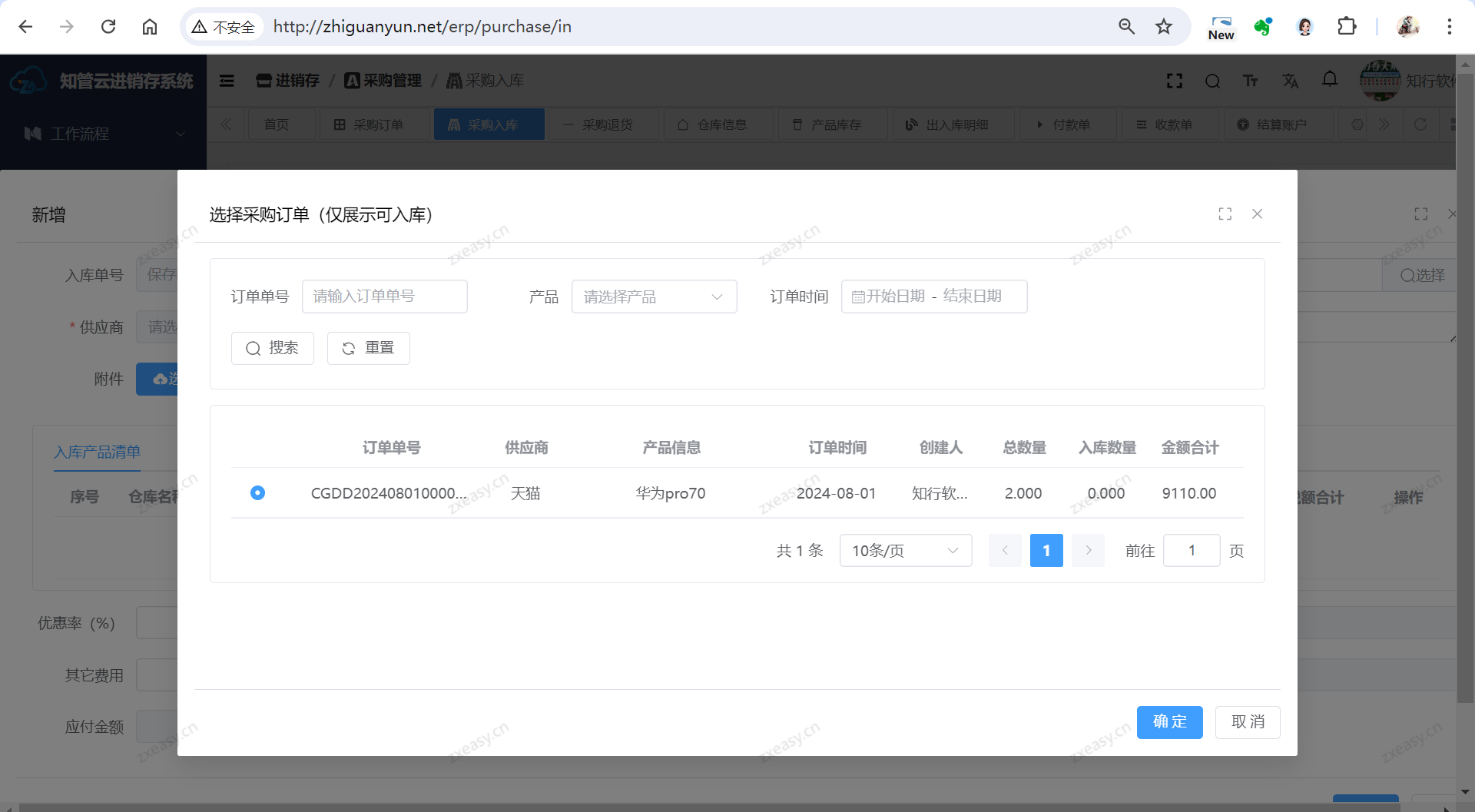 关闭 “开单自动生成出入库单” 设置,提交一个进货单单据,然后手动生成入库单。