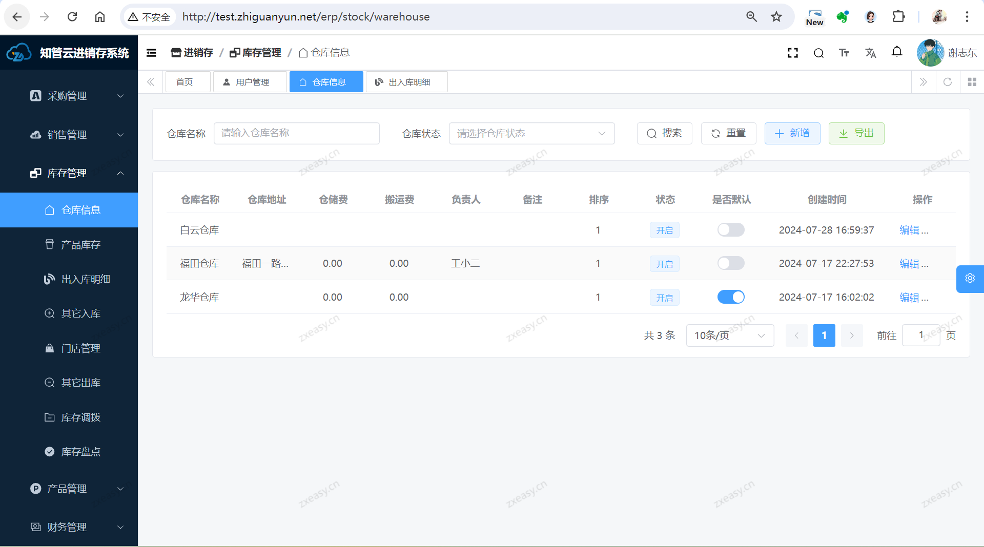 仓库管理,主要用户仓库的增加、删除等维护操作,包含设置默认仓库,开启和关闭仓库使用状态。
